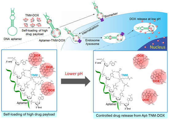 Our findings provide a new approach with which to develop aptamer-based therapeutics that (1) carry a high drug payload and (2) have a pH-controlled drug release mechanism. In addition, the Apt–TNM-DOX platform can also be used for targeted chemotherapy to treat different types of cancer by using aptamer sequences specific to cells of interest.