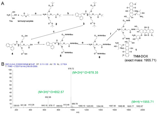 Synthesis of TNM-DOX. (A) The scheme of TNM-DOX synthesis. Reagents and conditions: (a) DMSO, 5 M NaOH, RT, 24 h; (b) Fmoc-Cl, DCM, NMM, RT, 1 h; (c) TFA/water = 95/5, RT, 90 min; (d) HBTU, DIEPA, DCM, tert-butyl carbazate, RT, overnight; (e) piperidine/DCM, RT, 1 h; (f) (1) TFA/DCM (1/1), RT, 30 min; (2) MeOH/AcOH/Pyridine (10/0.1/0.1), DOX, RT, overnight. (B) Mass Spectrum of TNM-DOX. MS (ESI): [M + H]+ = 1955.7, [M + 2H]2+/2 = 978.4, [M + 3H]3+/3 = 652.6. (DMSO = Dimethyl sulfoxide, Fmoc-Cl = Fluorenylmethyloxycarbonyl chloride, DCM = Dichloromethane, NMM = N-Methylmorpholine, RT = room temperature, TFA = Trifluoroacetic acid, HBTU = N,N,N′,N′-Tetramethyl-O-(1H-benzotriazol-1-yl) uronium hexafluorophosphate, DIPEA = N,N-Diisopropylethylamine, MeOH = Methanol, AcOH = Acetic acid, DOX = Doxorubicin).