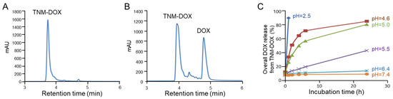 Free DOX release from TNM-DOX. (A) HPLC analysis of synthetic TNM-DOX. (B) HPLC analysis of free DOX release (in milli absorbance units, mAU) from TNM-DOX over time. (C) Time course of free DOX release from TNM-DOX under different pH conditions. Release of free DOX at 1, 2, 4, 6, and 24 h post-incubation in buffers at different pH as indicated.