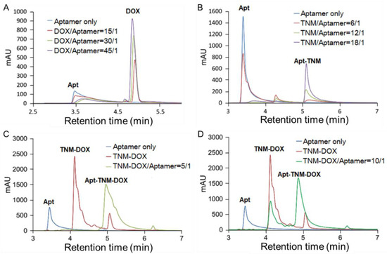 TNM structure mediates self-loading of a high drug payload into aptamer sequences. (A) HPLC analysis of the aptamer-DOX complex. (B) HPLC analysis of TNM structure conjugated with aptamer sequences. (C,D) HPLC analysis of aptamer–TNM–DOX conjugate formation at molar ratios 5:1 and 10:1 of TNM-DOX to aptamer, respectively. Aptamer–TNM–DOX conjugates carried a high drug payload of 15 DOX molecules per aptamer sequence.