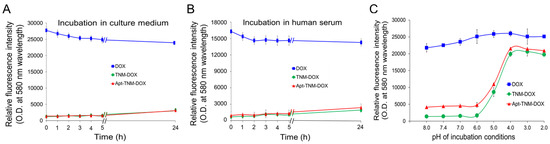 In a stability study, Apt–TNM-DOX was incubated in cell culture medium with 10% fetal bovine serum (FBS) or human serum for 24 h and free DOX release from Apt–TNM-DOX was kinetically monitored by detecting fluorescent signals of free DOX in reactions. Figure 5A,B shows that Apt–TNM-DOX was stable up to 24 h with minimal drug release. To validate controlled drug release, Apt–TNM-DOX was incubated in a medium with different pH conditions for 24 h, and changes in fluorescent signals derived from free DOX in reactions were monitored. Apt–TNM-DOX was stable when pH ≥ 6.0 (including physiological pH 7.4), released its drug payload when pH was below 6.0, and reached maximal release at pH 4.0 (Figure 5C). Thus, Apt–TNM-DOX can stably carry and deliver its drug payload under physiological conditions and efficiently release drug payload once triggered by a low pH, which characterizes tumor cell lysosomes.