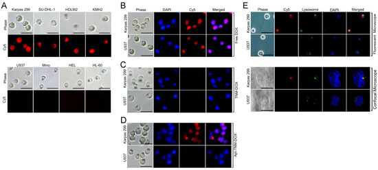 To detect target cell uptake of Apt-TNM-DOX, Karpas 299 and U937 cells were incubated with Cy5-labeled Apt–TNM-DOX (100 nM) and Lyso-Tracker Green DND-26 (Invitrogen) according to the manufacturer’s instructions at 37 °C for 60 min. The cells were washed once with PBS and fixed with 4% formaldehyde at RT for 10 min. After being washed with PBS, the cells were suspended in PBS and loaded onto a glass slide with a coverslip. Intracellular fluorescent signal was examined using a Nikon A1 Confocal Imaging System (Nikon, Tokyo, Japan).