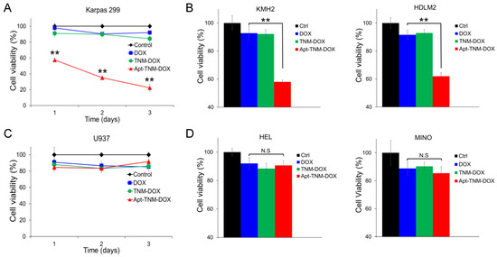Apt–TNM-DOX specifically targets lymphoma cells and inhibits cell growth. (A) Apt–TNM-DOX treatment inhibited the growth of Karpas 299 lymphoma cells. (B) Three days after Apt–TNM-DOX treatment, a similar inhibitory effect was observed in KMH2 and HDLM2 lymphoma cells. (C) Apt–TNM-DOX treatment had no effect on off-target U937 control cells. (D) No inhibitory effect on additional off-target control cells, HEL and Mino cells was observed three days after Apt–TNM-DOX treatment. ** p < 0.01. N.S. indicates that the difference was not significant.