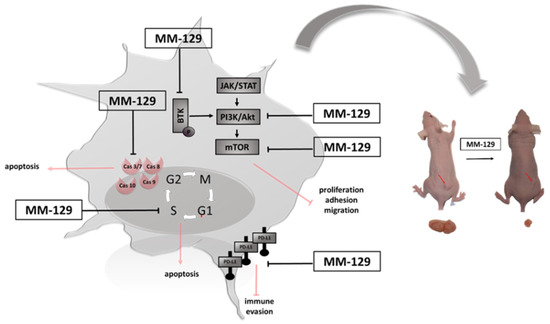 We have recently shown that MM-129 effectively inhibits tumor development in both zebrafish xenografts and mice Foxn1nu/cmdb challenged with DLD-1 and HT-29 cells. We also found that it has the ability to reduction of PD-L1 expression with a simultaneous attenuate intracellular pathways promoting tumorigenesis inducing cell cycle arrest, like protein kinase B (Akt), mammalian target of rapamycin (mTOR), CDK2 and Bruton’s tyrosine kinase (BTK) (Figure 1) [10]. BTK is a member of the Tec family of nonreceptor protein tyrosine kinases which plays an important role in the development of B cell lymphoma and other solid tumors, including breast, ovarian, prostate and colon cancer [11,12,13]. Inhibition the activity of BTK through the use of ibrutynib or sorafenib effectively inhibits the neoplastic process. BTK inhibitors have been FDA-approved as the front-line treatment for B cell malignancy CLL/SLL. Future treatment strategy of solid tumors has yet to be fully evaluated [14,15].