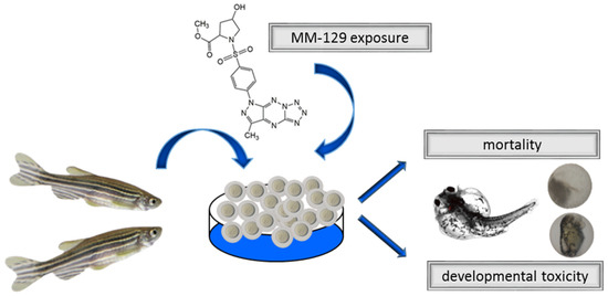 Schematic representation of exposure of zebrafish to MM-129. Abbreviations: MM-129—pyrazolo[4,3-e]tetrazolo[4,5-b][1,2,4]triazine sulfonamide.