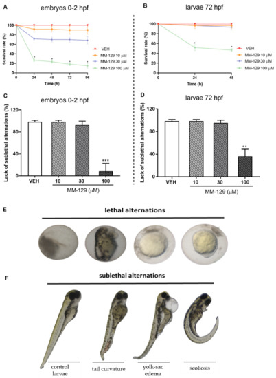The survival and early embryonic development were examined at 24, 48, 72 and 96 h after exposure to MM-129. There were no significant differences between untreated embryos and embryos incubated with 0.1% DMSO. Mortality or developmental malformations in untreated embryos was not recorded at any time of the observation. Figure 4A show that at 96-h post-exposure the recorded survival was 90%, 68% and 15%, respectively in the group of embryos exposed to MM-129 at 10, 30 and 100 μM. The most prominent effects on the embryo survival and development were present at the beginning of treatment in these studied groups. Embryo phenotypic features were analyzed at 24 hpf (Figure 4E) and 96 hpf (Figure 4F). At the concentration of 100 μM malformations, such as spinal scoliosis, pericardial and yolk sac edema and tail curvature were observed (92%) (*** p < 0.001) (Figure 4C,F), whereas at the concentration of 30 μM and 10 μM these malformations were less frequent (8%) or none respectively.