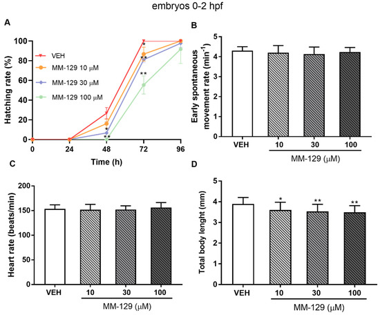The embryo hatching rate, determined by counting of zebrafish larvae outside the eggshell, was observed at 48 and 72 hpf, as hatching normally occurs during this period. The hatching rate of untreated embryos was approx. 27% at 48 hpf and 100% at 72 hpf. About 13% less of the embryos treated with 10 μM of MM-129, hatched at 72 hpf (* p < 0.05). MM-129 at the concentrations of 30 and 100 μM also delayed the hatching of 19% and 55% embryos respectively (** p < 0.01) (Figure 5A).