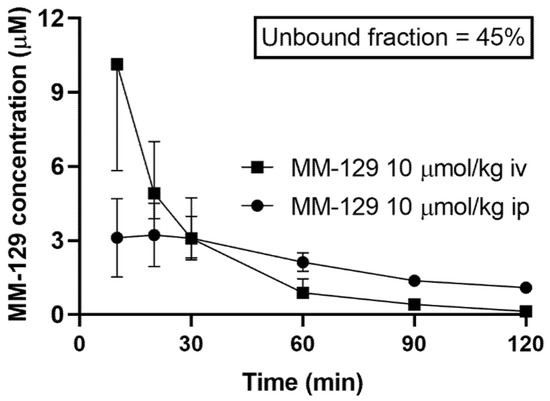 MM-129 was administered to rats in the dose of 10 μmol/kg either intravenously, intraperitoneally, or orally to assess its pharmacokinetic properties. We found that MM-129 was quickly absorbed, with the time (Tmax) required to reach the maximum plasma drug concentration (Cmax 2.22–4.69 μmol/L) being 10–30 min after i.p. administration with relatively high bioavailability (68.6%). The plasma concentration-time curves of MM-129 after intravenous and intraperitoneal administration are shown in Figure 6.