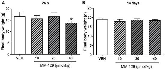 Final body weight of mice exposed to MM-129 concentrations or vehicle (VEH) after short-term administration (A) and long-term administration (B). Data are shown as mean ± SD; * p < 0.05 vs. VEH within the group n = 6–10 for each concentration. Abbreviations: MM-129—pyrazolo[4,3-e]tetrazolo[4,5-b][1,2,4]triazine sulfonamide; VEH—vehicle.