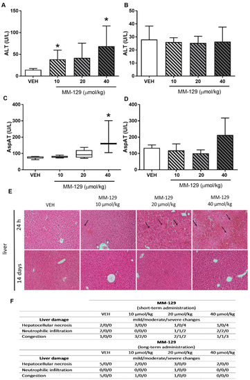 Alanine transaminase (ALT) (A,B) and aspartate transaminase (AST) (C,D) in mice treated with MM-129 concentrations or vehicle (VEH) after short-term administration (A,C) and long-term administration (B,D). Representative micrographs of tissue sections of liver, (original magnification, 10) (E) and selected clinical and gross necropsy observations of liver during safety study in mice after short-term and long-term administration of MM-129 and VEH (F). Original magnification, 10; hematoxylin and eosin staining. Data are shown as mean ± SD; * p < 0.05 vs. VEH within the group, n = 3–10. Abbreviations: ALT—alanine transaminase; AspAT—aspartate aminotransferase; MM-129—pyrazolo[4,3-e]tetrazolo[4,5-b][1,2,4]triazine sulfonamide; VEH—vehicle.