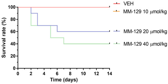In the long-time study, MM-129 treatment-related mortalities were recorded in animals treated with a dose of 20 and 40 μmol/kg (Figure 9). The dose of 20 μmol/kg caused 40% of deaths in mice within the first week, and induced the incidence of low hypoactivity in some animals. At the higher dose of 40 μmol/kg, the mortality rate increased to 60% (6/10), and clinical signs of toxicity, such as hypoactivity, asthenia, and piloerection were more pronounced. MM-129 at a dose 10 μmol/kg did not produce mortality and signs of toxicity in mice over the observation period.