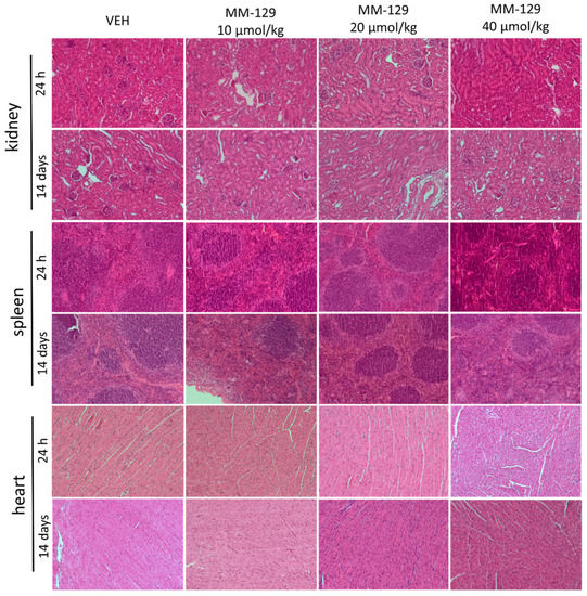 Necropsy and histopathological examinations were performed on the liver, spleen, kidneys and heart of each animal to assess the damage to the internal organs or tissues after 24 h and 14 days after the termination of the experimental procedure. A routine histopathological examination showed normal spleen, kidneys and heart morphology of the vehicle-injected animals (Figure 10). The specimens of these organs in all MM-129 treated groups did also not show any pathological features, whereas MM-129 associated pathology of the liver tissue was seen in mice, after the first 24 h of the experiment. Though the image of the liver lobules construction was preserved, yet 24 h after MM-129 injection the analysis of liver showed a large area of hepatocyte necrosis, neutrophilic infiltration and hepatic hyperemia in animals treated with doses of 20 and 40 μmol/kg (Figure 8E,F). For both groups, severe necrotic changes of hepatocytes were found in 4/5 of the cases (80%). In turn, two and three animals showed mild necrotic changes, which were from the control and MM-129 (10 μmol/kg) treated groups respectively. In turn, all the submitted organs essentially showed normal histology after a long-term exposition to MM-129 at all doses.