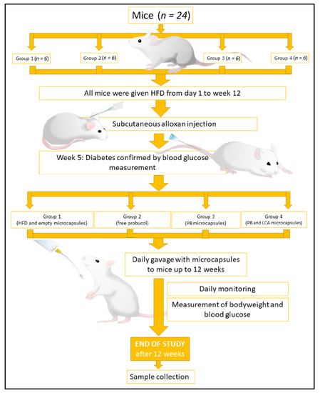 All mice were fed with a high-fat diet (HFD) consisting of feed enriched with 30% (w/w) lard, 15% (w/w) fructose, and 0.5% (w/w) cholesterol (Specialty Feeds, Perth, Australia). for twelve weeks. At week 4, 50 mg/kg/bodyweight of alloxan was given subcutaneously to accelerate the development of a pre-diabetic condition [44,45,46,47]. After a week of alloxan injections, all mice showed pre-diabetic signs; mice demonstrating a blood glucose level of ≥11 mmol/L, together with signs and symptoms of diabetes, were considered pre-diabetic [44,48]. Following this, twenty-four mice were arbitrarily divided into four equal groups. Group 1 was orally gavaged with empty microcapsules, group 2 with free PB (powder) (PB: 80 mg/kg/day), group 3 with PB microcapsules (PB: 80 mg/kg/day), and group 4 with PB-LCA microcapsules (PB: 80 mg/kg/day and LCA: 40 mg/kg/day). The dosage of microcapsules was calculated according to our previous studies [27,49].