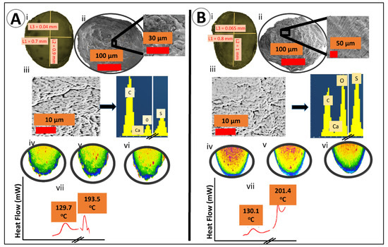 (A) F-1; PB-SA microcapsules; (i) optical image, (ii) SEM image at 100 μm, (iii) EDXR spectra and corresponding analysis, (iv–vi) micro-CT-analysis reflecting the internal structure and morphology, (vii) DSC thermograms. (B) F2; PB-LCA-SA microcapsules; (i) optical image, (ii) SEM image at 100 μm, (iii) EDXR spectra and corresponding analysis, (iv–vi) micro-CT-analysis reflecting the internal structure and morphology, (vii) DSC thermograms.