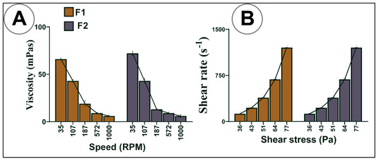 Table 2 and Figure 3A,B show the rheological behaviours of both formulations under various mixing speeds. The addition of LCA to F1 did not considerably alter the rheological parameters (viscosity, torque, shear stress, and shear rate). The pattern showed that as speed increased, viscosity decreased (Figure 3A), and torque increased (Table 1). Figure 3B indicates that shear stress and shear rate had a direct relationship; when one increased, the other also increased, suggesting non-Newtonian thixotropic behaviour [52].