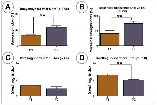 (A) Buoyancy index at pH 7.8, (B) mechanical resistance at pH 7.8, (C,D) swelling index at pH 3 and (D). F1 = PB-SA microcapsules, F2 = PB-LCA-SA microcapsules. N = 3, mean ± SD. p < 0.01 **.