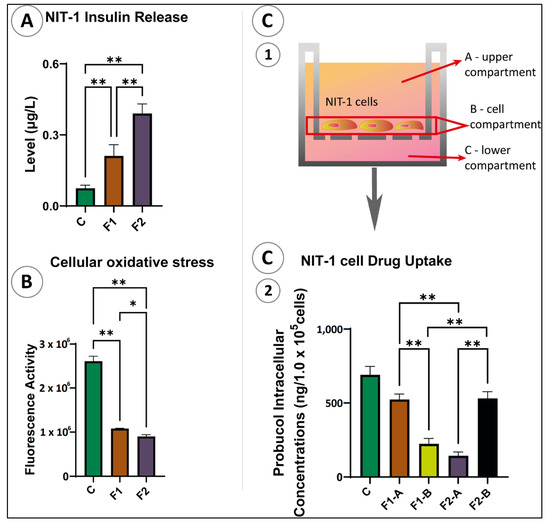 Figure 5 shows the total insulin production (Figure 5A), antioxidant assay (Figure 5B), and PB cellular uptake (Figure 5C) of pancreatic β-cells at 35 mM glucose concentration over 48 h for untreated cells (control—empty microcapsules), F1, and F2 microcapsules. Figure 5A shows F1 microcapsules significantly increased insulin level (p < 0.01). Likewise, in Figure 5B, treated NIT-1 cells showed lower fluorescence activity, which indicates more significant antioxidant activity. The LCA addition on F1 microcapsules not only enhanced insulin secretion but also showed high antioxidant activity (p < 0.01).