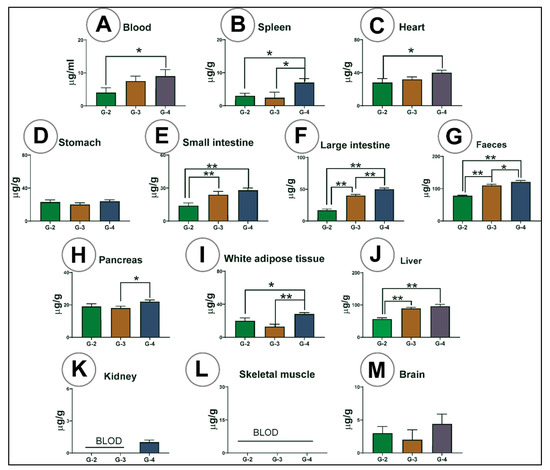 PB concentration (µg/mL or µg/g) in blood (A), spleen (B), heart (C), stomach (D), small intestine (E), large intestine (F), faeces (G), pancreas (H), white adipose tissue (I), liver (J), kidney (K), skeletal muscle (L) and brain (M). G-2 = mice treated with free PB, G-3 = mice treated with PB-SA = F1 microcapsules, G = 4 mice treated with PB-LCA-SA = F2 microcapsules. BLOD = below the limit of detection. Data are presented as mean ± SD. p < 0.05 *, p < 0.01 **.