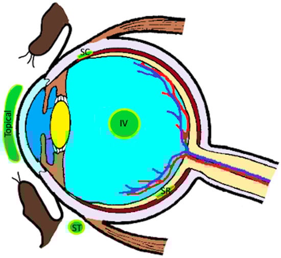 There a several routes that drugs can be delivered to the eye. They include systemic (i.e., oral or parenteral routes which may include intravenous or subcutaneous routes), topical, periocular (i.e., subconjunctival, subtenon’s, suprachoroidal), or intravitreal administration, with the most common route being topical administration of eye drops (Table 2, Figure 2). Most non-systemic routes of administration require inoculation of the drug directly into the targeted ocular space or absorption across the cornea, conjunctiva, and sclera [4,5].