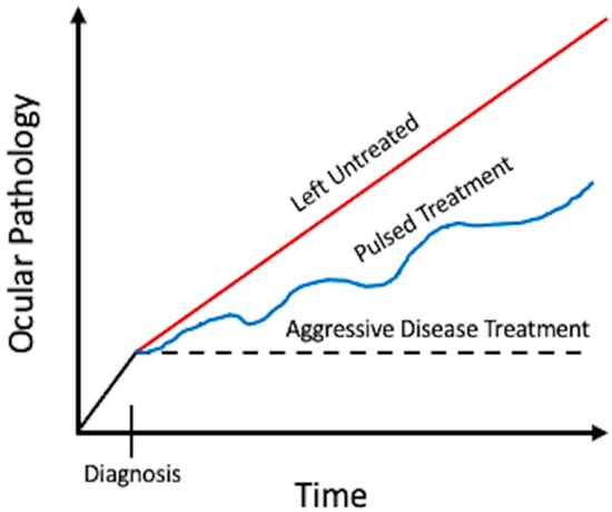 Our hypothesized rate of pathological changes in a uveitic eye with or without treatment. Red line, no treatment; blue line, periodic steroid pulses (either locally or systemically), black dotted line, adequately treated uveitis.