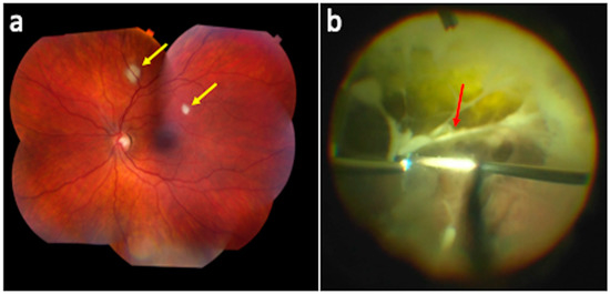 Intraocular fungal complications. A patient with candida chorioretinitis (a, yellow arrows) versus a patient with candida chorioretinitis with a “string of pearls” (b, red arrow).