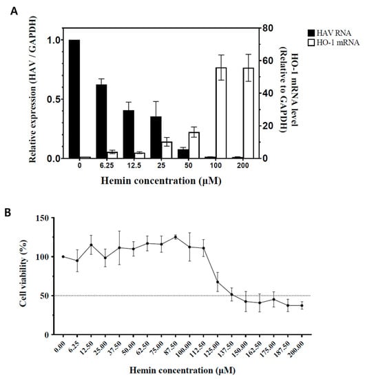 FRhK-4 cells infected with HAV were treated with different doses of hemin. The mRNA expression levels of HO-1 were determined relative to GAPDH expression. Hemin induced mRNA expression of HO-1 in a dose-dependent manner as expected. RT-qPCR for detection of the non-coding region of HAV RNA was conducted with the same samples to determine the correlation between the quantity of HO-1 mRNA and HAV RNA. As the concentrations of hemin increased, the amount of HAV RNA decreased in the HAV-infected cells (Figure 1A). We additionally verified the reduced expression of the RdRp gene, which plays a key role in the replication of virus (Figure S1). A cell cytotoxicity assay using MTT was conducted because the decrease in the HAV RNA quantity could be reduced by cytotoxicity, which may be induced by high concentrations of hemin. Cell viability was calculated 3 days later in FRhK-4 cells, which were treated with various concentrations of hemin (Figure 1B). The CC50 and 50% effective concentration (EC50) of hemin were calculated (Table 1). The absence of cell cytotoxicity and significant suppression of the viral RNA replication were confirmed with 50 μM hemin (Figure 1A,B). Therefore, we conducted other experiments with less than 50 μM hemin in this study.