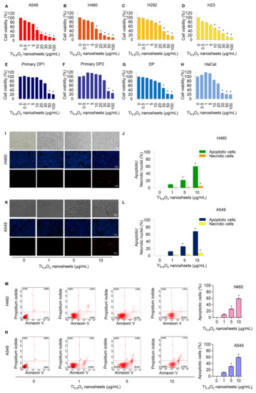 Cells were treated with various concentrations of Ti0.8O2 nanosheets (0–100 µg/mL) and analyzed by MTT assay. The results revealed the statistically significant cytotoxic effects of the Ti0.8O2 nanosheets occurred at concentrations of 10–100 μg/mL in A549, H460, and H23 cells and at 20–100 μg/mL in H292 cells. In the primary dermal papilla cells from different sources (DP1 and DP2), cytotoxic effects of the Ti0.8O2 nanosheets were found at 50 μg/mL. Moreover, at the concentration of 30 μg/mL, the Ti0.8O2 nanosheets showed statistically significant cytotoxic effects on DP and HaCat cells (Figure 2A–H). Characteristic apoptosis cells were identified using a nuclear staining assay. The results showed that the Ti0.8O2 nanosheets mediated apoptosis in lung cancer cells at concentrations of 1–10 μg/mL, with a small percentage of necrotic cells (Figure 2I–L). Flow cytometry analysis based on annexin V/PI detection also confirmed that 10 μg/mL of Ti0.8O2 nanosheets induced dramatic apoptosis in A549 and H460 cells compared with untreated cells (Figure 2M,N).