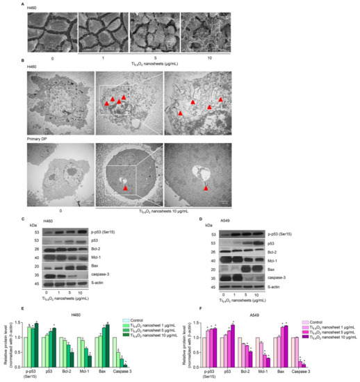 In order to investigate the mechanism of Ti0.8O2 nanosheet-induced apoptosis, the apoptotic-related proteins were determined by Western blot analysis. A549 and H460 cells were treated with 0–10 μg/mL Ti0.8O2 nanosheets, and then the pro-and anti-apoptotic proteins related to mitochondria-mediated apoptosis were evaluated. The results showed that the Ti0.8O2 nanosheets increased the pro-apoptotic protein Bax, whereas the anti-apoptotic proteins Mcl-1 and Bcl-2 were downregulated in the cells treated with the Ti0.8O2 nanosheets. In addition, pro-caspase3 decreased in a concentration-dependent manner. Moreover, Ti0.8O2 nanosheets caused a significant increase in both p-p53 (Ser15) and total p53 protein levels in a dose-dependent manner (Figure 3C–F). These findings suggest that p53 may play a role in Ti0.8O2 nanosheet-induced apoptosis of NSCLC cells. Taken together, it can be concluded that the Ti0.8O2 nanosheets mediated the apoptosis of lung cancer cells by increasing pro-apoptotic proteins, which led to cell death by the mitochondria-dependent pathway.