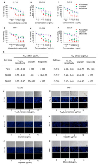 To assess the potential pharmacological activities of synthetic Ti0.8O2 nanosheet compounds in advanced lung cancer cells, treatment with current standard therapeutic agents was also performed for comparison. Two groups of cell lines were used for the investigations: Panel A, an advanced non-small cell lung cancer cell line from patients with malignant pleural effusion who had never been treated by chemotherapy, targeted therapy, or immunotherapy, and Panel B, an advanced non-small cell lung cancer cell line from patients with malignant pleural effusion who had been treated with standard platinum-doublet chemoRx with or without targeted therapy or a checkpoint inhibitor and second-line chemoRx. In total, six primary lung cancer cells were treated with the same concentrations of Ti0.8O2 nanosheets, cisplatin, and etoposide (0–100 μg/mL) for 24 h and subjected to cell viability analysis by MTT assay. The Ti0.8O2 nanosheets could be considered nontoxic at doses lower than 1 μg/mL, while a concentration of more than 10 μg/mL caused a significant decrease in the cell viability of the cells (Figure 4A–F). In contrast, the standard drugs showed slightly decreased cell viability from 0.5 to 100 μg/mL, while doses of more than 20 μg/mL cisplatin and etoposide were considered toxic. Data analysis showed that the IC50 of the Ti0.8O2 nanosheets was lower than 10 μg/mL at 24 h, which was significantly lower than for cisplatin and etoposide (Figure 4G). The results showed that the Ti0.8O2 nanosheets reduced cell viability in a concentration-dependent manner compared with the untreated controls (Figure 4A–F). To confirm the effect of the Ti0.8O2 nanosheets on advanced lung cancer cells from patients, a nuclear staining assay using Hoechst 33342 and propidium iodide was performed and the results analyzed. After treatment with the compounds at 10 μg/mL of Ti0.8O2 nanosheets, apoptotic cells were observed by the presence of nuclear condensation morphology in the representative cell line (Figure 4H–M). It was found that the potency of the nanosheets was dramatically higher than that of cisplatin and etoposide.