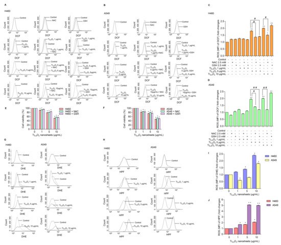 Ti0.8O2 nanosheets induced intracellular ROS in H460 and A549 cells. (A–D) The effect of Ti0.8O2 nanosheets (0–10 g/mL) on intracellular ROS induction at 24 h in H460 and A549 cells was determined by flow cytometry with the fluorescent probe DCF (10 µM). Cells were treated with Ti0.8O2 nanosheets (0–10 µg/mL) alone for 24 h or with the pretreatment of 2.5 mM NAC and 2.5 mM GSH. ROS levels were calculated and presented as the mean fluorescence intensity (MFI); (E,F) effect of Ti0.8O2 nanosheets on cell viability in H460 and A549 cells at 24 h with the pretreatment of 2.5 mM NAC or 2.5 mM GSH was determined by an MTT assay. Data are shown as the mean ± SEM (n = 3); (G,I) the effect of Ti0.8O2 nanosheets (0–10 µg/mL) on superoxide anion induction at 24 h in H460 and A549 cells was determined by flow cytometry with the fluorescent probe DHE (10 µM). Superoxide anion levels were presented as mean fluorescence intensity (MFI); (H,J) the effect of Ti0.8O2 nanosheets (0–10 µg/mL) on hydroxyl radical induction at 24 h in H460 and A549 cells was determined by flow cytometry with the fluorescent probe HPF (10 µM). Hydroxyl radical levels were calculated and indicated as the mean fluorescence intensity (MFI). All data are shown as the mean ± SEM (n = 3). * p < 0.05, ** p < 0.01 compared with the untreated control, and # p < 0.05, ## p < 0.01 compared with the treated cells at the same concentration of Ti0.8O2 nanosheets.