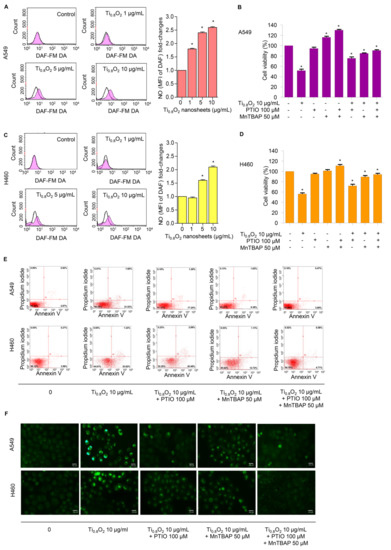 Ti0.8O2 nanosheets induced NO in A549 and H460 cells and mediated peroxynitrite generation in these cells. (A,C) Effect of Ti0.8O2 nanosheets on NO levels in A549 and H460 cells. Cells were treated with DAF-FM DA and various concentrations of Ti0.8O2 nanosheets (0–10 µg/mL) for 30 min, and the peroxynitrite levels were determined at 3 h by flow cytometry. NO levels are presented as mean fluorescence intensity (MFI); (B,D) the cytotoxic effect of Ti0.8O2 nanosheets and the NO scavenger (PTIO) on A549 and H460 cells. Effect of Ti0.8O2 nanosheets and the NO scavenger (PTIO) on cell viability. Cells were treated with Ti0.8O2 nanosheets (10 µg/mL) in the presence or absence of pretreatment with a NO scavenger (PTIO) (100 µM) or pretreatment with a superoxide inhibitor (MnTBAP) (50 µM) for 24 h by MTT assay; (E) apoptotic and necrotic cells were determined using annexin V-FITC/PI staining with flow cytometry; (F) cellular NO level stained with DAF-FM DA in cells treated with Ti0.8O2 nanosheets (10 µg/mL) or pretreated with PTIO (100 µM) or MnTBAP (50 µM) were determined by visualization under a fluorescence microscope. All data are shown as the mean ± SEM (n = 3). * p < 0.05 compared with the untreated control.