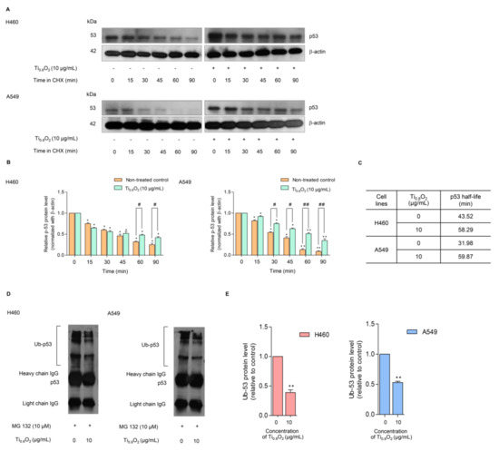 Moreover, the turnover of the p53 protein is tightly regulated by ubiquitin–proteasome degradation. Thus, we used the specific proteasome inhibitor (MG132) to investigate whether the Ti0.8O2 nanosheets increased p53 stability via the inhibition of proteasomal degradation. Co-immunoprecipitation was also used to test the premise of ubiquitin-mediated p53 degradation in H460 and A549 cells after treatment with 10 µg/mL of Ti0.8O2 nanosheets and in non-treated control cells for 1 h. Figure 8D,E shows that the polyubiquitination of p53 was slightly diminished after Ti0.8O2 nanosheet treatment when compared with control.