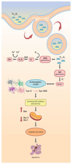 The p53 protein plays a crucial role as a transcription factor regulating the expression of many proteins controlling cell arrest and apoptosis [58]. The p53 protein contains a tetramerization domain (p53TD) and a DNA-binding domain (p53DBD) which are important for protein functions [59]. Interestingly, evidence indicates that the activity of the p53 protein is highly dependent on tetrameric complex formation and complex stability [60]. Therefore, molecules capable of stabilizing the tetrameric form of the proteins could be promising therapeutical tools. Furthermore, we report additional studies on the role of hydrogen bond interactions in protein stability and the key binding residues of p53 to direct the effect of S-nitrosylation (Figure 9). In globular proteins, there are intermolecular hydrogen bonds between the protein and water molecules and between water molecules that are bound with the proteins [61]. Here, we used computational tools to predict the point of S-nitrosylation on the p53 protein and found that peroxynitrite may directly control p53 by S-nitrosylation to stabilize the tetrameric structure of this protein. To estimate the contribution of these hydrogen bonds to the conformational stability of a protein compared with that of the native p53 and S-nitrosylation of p53 [62], we investigated the relationship between S-nitrosylation and the increase in p53 stability. We identified the H-bond intermolecular interactions between a monomer of native p53 compared to its S-nitrosylation form and found higher stability of the tetrameric protein–protein complex in comparison to the native p53, especially regarding the reactivity of the cysteine at residue 182 in p53. The high reactivity of specific cysteine thiol groups in p53 is likely important for the regulation of p53 and its degradation pathways [38]. Moreover, peroxynitrite has been shown to activate the opening of mitochondrial pores that release cytochrome c into the cytoplasm [63]. According to our results, we found that peroxynitrite induces p53 stability and increases the activation of Bax and, subsequently, caspase 3. These changes are all hallmarks of cell death (Figure 10). Furthermore, the nanosheets were shown to generate peroxynitrite in aggressively driven mechanisms, including the process for the S-nitrosylation of p53 for protein stabilization. This novel finding on the role of Ti0.8O2 nanosheets in p53-mediated apoptosis may have important implications in cancer treatment.
