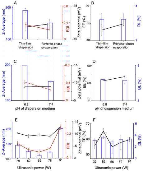 Effect of different factors during the preparation process on the characteristics of Mel-Lip: preparation method (A,B), pH of PBS (C,D), ultrasonic power (E,F). (n = 3).