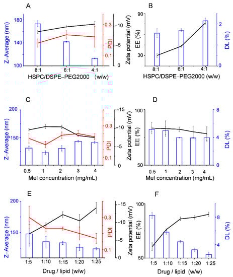 Effect of different factors during the preparation process on the characteristics of Mel-Lip: HSPC to DSPE-PEG2000 mash ratio (A,B), concentration of melittin (C,D), drug to lipid mass ratio (E,F). (n = 3).