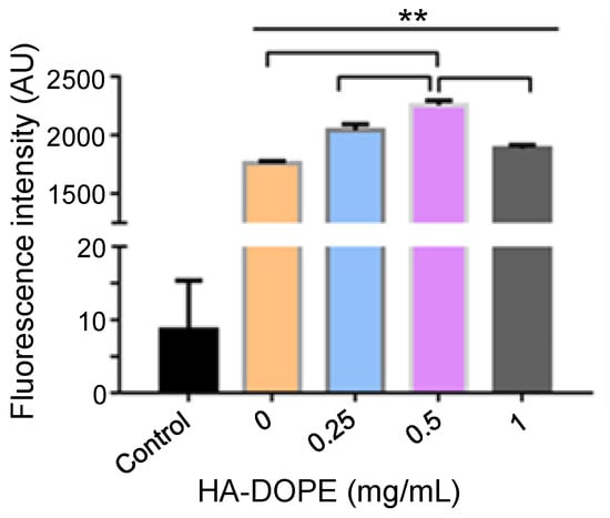 Mean fluorescence intensity of B16F10 cells following treatment with C6-HA-Lip with different HA-DOPE concentrations. (Comparison between groups, ** p < 0.01; n = 3).