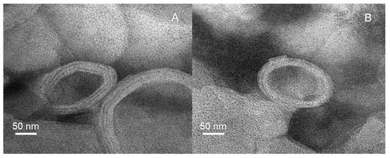 The preparations were diluted with deionized water and then dripped slowly on a copper mesh. Thirty minutes later, dry filter paper was used to remove excess liquid. Finally, the preparations negatively stained with uranyl acetate for 30 s were observed under a transmission electron microscope (TEM; JEM-2100, JEOL Co. Ltd., Tokyo, Japan).