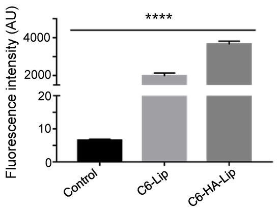 Mean fluorescence intensity of B16F10 cells following treatment with C6-Lip and C6-HA-Lip. (Comparison between groups, **** p < 0.0001; n = 3).