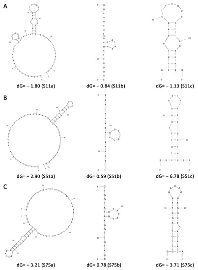 The three selected aptamers, (A) S11, (B) S51, and (C) S75 in three presentations: entire aptamer (left), variable region (middle), and structured region (right). All dG values are expressed in Kcal/mol.