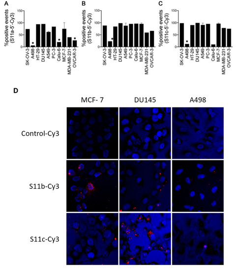 (A–C) Percentage of positive events of MUC1/Y in SK-OV-3, A498, HT-29, DU145, A549, PC-3, Calu-6, MCF-7, MDA-MB-231 and OVCAR-3 using the aptamers (A) S11a, (B) S11b, and (C) S11c. (D) Representative immunofluorescence of MCF-7, DU145, Calu-6, and A498 cells stained with control-Cy3 (aptamer SP68; selected against a different/non-MUC1 tumour marker peptide), S11a-Cy3 or S11b-Cy3, * p < 0.05.