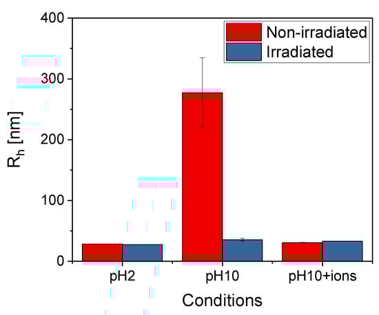 The weight-average molecular weight of the pristine polymer in the solution (pH = 10; 0.5 mol · dm−3 NaClO4) was found to be 8.87 × 105 Da, with radius of gyration of 115 nm and a hydrodynamic radius of 42 nm. Two batches of nanogels were synthesized by pulse-irradiating deoxygenated aqueous solutions of PAA at pH 2 with a dose of ca. 5 kGy. The nanogels from the first batch, marked as NG_I (dose 5.3 kGy, final Mw = (1.26 ± 0.09) × 106 Da, Rg = 94 ± 5 nm, and Rh = 45 ± 4 nm), were used, without further filtration, for coupling with the model compound and DOTA-bombesin derivative supplied by an external company. The nanogels of the second batch NG_II (dose 5.3 kGy, final Mw = (1.13 ± 0.11) × 106 Da, Rg = 86 ± 22 nm, and Rh = 35 ± 0.8 nm), prior to further coupling steps, were filtered and the parameters changed to Mw = (3.83 ± 0.3) × 105 Da, Rg = 41 ± 2 nm, and Rh = 30 ± 4 nm. These nanogels were used for coupling tests with DOTA-bombesin derivative and bombesin derivative without DOTA, which were synthesized in the authors’ laboratory. The absorbed dose of ca. 5 kGy was chosen to induce sufficient internal crosslink density and stability of the so-formed structures. It was found that they were colloidally stable, both in water and biologically relevant solvents such as PBS or cell culture media (RMPI1640). Moreover, they could be also safely freeze-dried or stored for at least two months (data not shown). The density of the polymer coil of NG_I and NG_II was much higher than the original coils of the linear polymer. This result confirms that intramolecular crosslinking plays a dominant role during radiation synthesis, and as a result, more densely packed polymer coils are obtained; this phenomenon is characteristic for nanogels as internally crosslinked macromolecules []. To further prove this, the hydrodynamic radius was also measured at various pH and ion strength conditions (pH 2 vs. pH 10 vs. aqueous solution of 0.5 mol · dm−3 NaClO4, pH 10) (Figure 1). It can be seen that in contrast to the non-irradiated linear polymer, the irradiated samples retained the compact conformation and small size in the changing environment.