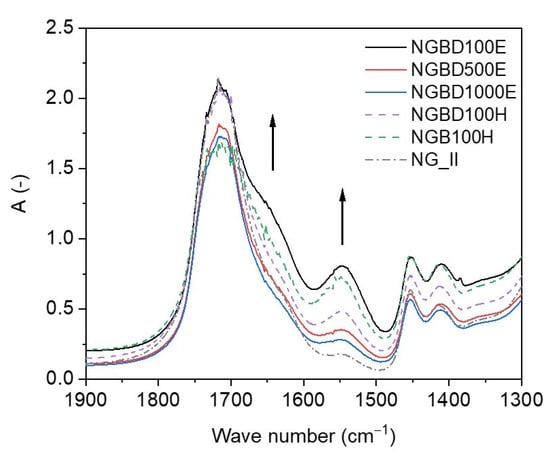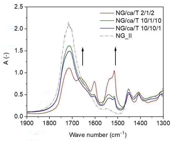 FTIR spectrum of three products of PAA nanogels coupling with p-toluidine (NG/ca/T) in different molar ratios: 2/1/2 and 10/10/1, and neat poly(acrylic acid) nanogels (NG_II).