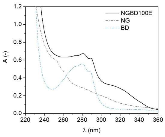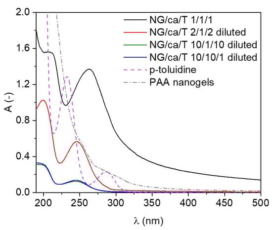 The coupling process was also followed by UV-Vis spectroscopy. The spectra of 0.16 mmol · dm−3 aqueous p-toluidine solution, pH 5.5, showed three bands at 198, 232, and 287 nm (Figure 3) [], whereas neat PAA nanogels showed a featureless spectrum with absorbance rising towards the far UV. These two spectra were compared with data obtained for products of the coupling process. Bands for the coupled products were visible in range of 190–325 nm, with the maximum at 198 nm and 245 nm, which was shifted to 260 nm for NG/ca/T 1/1/1 sample (Figure 3). Comparing the spectrum of p-toluidine and the coupling products, one can see a certain shift in the bands. The pH of all samples was set as a value above the p-toluidine pKa = 5.1 []; hence, these differences did not originate from varying pH values, but rather from differences in the electronic structure between the starting amine and resulting amide, which may have been particularly pronounced in this system due to the aromatic character of the substituent. The peak shifts in the coupling products spectra made it impossible to quantify the content of p-toluidine. Therefore, another method was used to characterize the product samples—1H NMR spectroscopy.