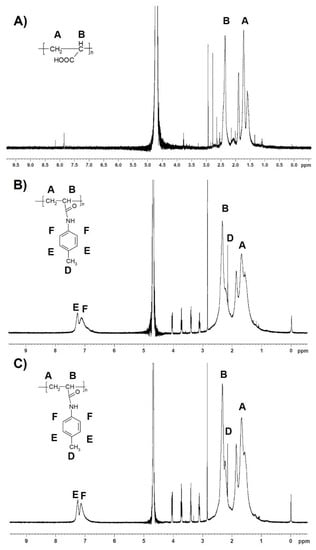 The 1H NMR spectrum of linear PAA has been studied before [,,]. The experimental spectrum of the PAA nanogels (Figure 4A) is consistent with those in the literature. High-intensity signal A (1.7 ppm) corresponded to the group CH2 and B (2.3 ppm) of the CH protons of poly(acrylic acid) nanogels. The integration of peaks, as in the literature spectrum, gave integral ratios for the poly(acrylic acid) nanogel backbone HA:HB = 2:1. Other bands of low intensity visible in the spectrum may have been a result of polymer chain fragmentation during irradiation, but the bands were so small that they were considered insignificant. The large peak at 4.7 ppm came from water and was visible in each spectrum.