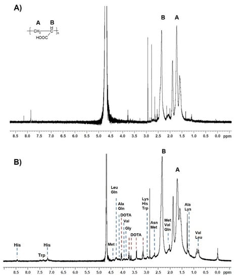 1H NMR spectra were recorded for the nanogels before and after coupling with the model compound/oligopeptide. The freeze-dried samples were dissolved in deuterated water. The measurements were performed using a Bruker Avance II 700 MHz UltraShield Plus NMR spectrometer (Bruker, Billerica, MA, USA).