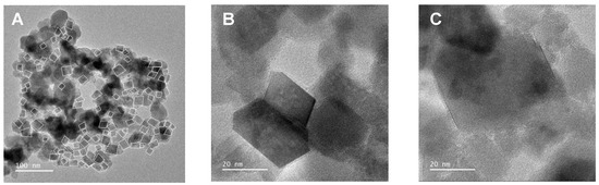 HR-TEM images of magnetic nanoparticles were recorded using a Transmission Electron Microscope JEOL JEM 2010F (JEOL Ltd., Tokyo, Japan) operating at 200 kV coupled to an Electron-Dispersive Spectroscopic analyzer (EDS). The processing of TEM images was performed using ImageJ software (version 1.52 p, National Institutes of Health (NIH), Bethesda, MD, USA).