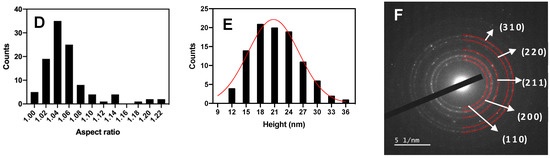 Transmission Electron Microscopy (TEM) analysis and small area electron diffraction (SAED) were carried out to determine the nanoparticles’ morphology, crystal structure, and their size distribution (Figure 3). From the statistical analysis of 106 outlined nanoparticles in Figure 3A, it was possible to extrapolate the mean length of major and minor axes of the particles and calculate the mean corresponding aspect ratio (height/width). In Figure 3B,C, it is possible to well distinguish elongated nanoparticles, which belong to a population with an aspect ratio slightly higher than 1. The aspect ratio distribution histogram is displayed in Figure 3D and reveals that nanoparticles generally present a cubic, slightly rectangular shape, resulting in a population with a mean aspect ratio of 1.04 ± 0.01. In addition, the size histogram was estimated considering the nanoparticles’ height (nm) and fitted to a Gaussian distribution, resulting in a population with a mean size of 20.8 ± 5.3 nm (Figure 3E), which is in accordance with the size estimated by XRD. The SAED ring pattern (Figure 3F) was indexed to a BCC structure, indexing (1 1 0), (2 0 0), (2 1 1), (2 2 0), and (3 1 0) from inside to outside.