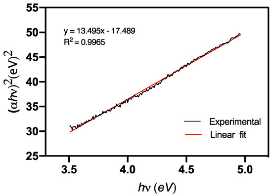 The optical properties of Ca0.25Mg0.75Fe2O4 ferrite nanoparticles were determined using the Tauc model for energy band gap estimation. The UV-visible absorption (or transmission) spectrum of the synthesized nanoparticles allows obtaining its optical band gap using a Tauc plot, which is given by Equation (10),