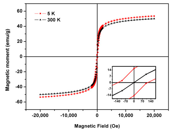 The magnetization measurements of shape-anisotropic Ca0.25Mg0.75Fe2O4 ferrite nanoparticles, upon calcination, were made at 5 K and 300 K. Figure 5 presents their magnetization hysteresis cycle, and the image inset shows a magnification of the low field region to make the coercivity more noticeable. The magnetic properties, including saturation magnetization (Ms), coercive field (Hc), and remnant magnetization (Mr), are displayed in Table 1.