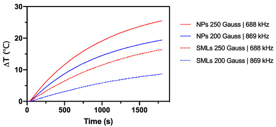 To assess the hyperthermia potential of the synthesized cubic Ca0.25Mg0.75Fe2O4 ferrite nanoparticles and SMLs based on those nanoparticles, their heating efficiencies were evaluated under an oscillating magnetic field at two different combinations field strengths and frequencies: (a) H = 250 Gauss and f = 869 kHz and (b) H = 200 Gauss and f = 688 kHz. For that, 1 mg of Ca0.25Mg0.75Fe2O4 ferrite nanoparticles were dispersed in 1 mL of water. Figure 6 shows a time-dependent temperature of the aqueous suspension under the application of an alternate magnetic field. The synthesized nanoparticles demonstrated a heating profile compatible with mild hyperthermia. The nanoparticles revealed a large temperature variation over 30 min, with a ΔT = 25.5 °C and ΔT= 19.4 °C for H = 250 Gauss and f = 869 kHz and H = 200 Gauss and f = 688 kHz, respectively. The corresponding SMLs showed lower temperature variations, with a ΔT = 19.4 °C and ΔT = 16.48 °C for the same combinations of field strengths and frequencies. Hertg and Dutz have estimated that the product of the applied magnetic field and oscillating frequency, when exposed to small body regions, should be H·f ≤ 5 × 109 A·m−1·s−1 [36]. Thus, the experiments here performed are slightly above this criterion limit.